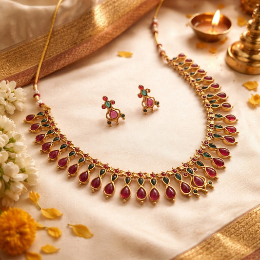 Rs. 899Sale price Rs. 650Vogue Essentials Collection: Ruby Stone Pendant and Earring Set