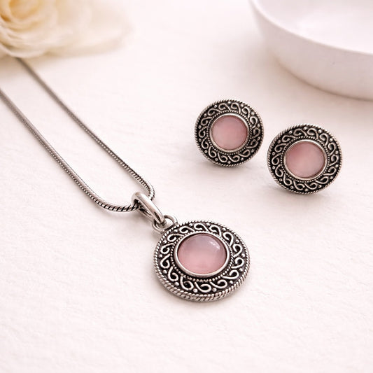 Rs. 899Sale price Rs. 650Vogue Essentials Collection: Pink Stone Pendant and Earring Set