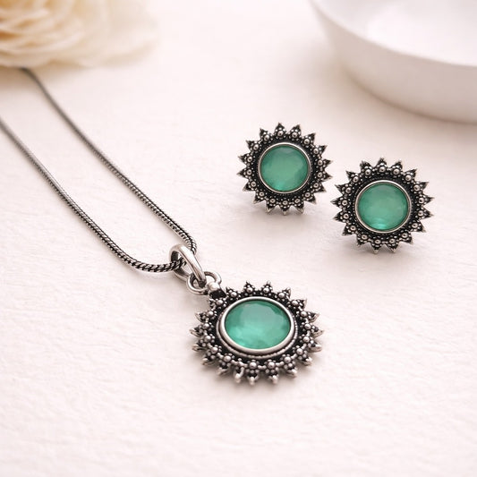 Rs. 899Sale price Rs. 650Vogue Essentials Collection: Aqua Green Stone Pendant and Earring Set