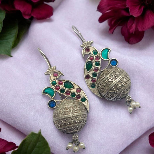 Rs. 330Sale price Rs. 280Opulent Aura: Oxidized Hooped Earrings with Pearl Drop and Tri-Colored Stones
