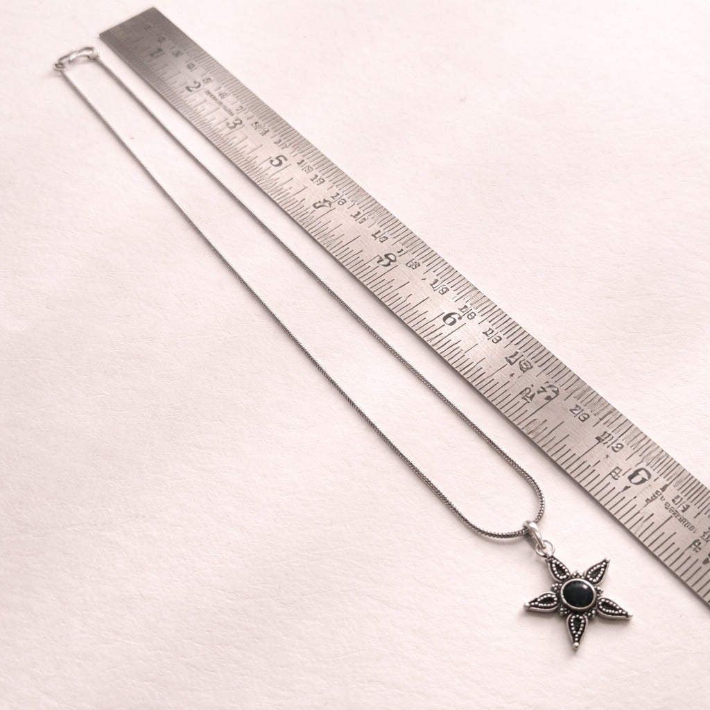A statement in subtle style, the delicate set is designed for those who gravitate towards timeless, bold elegance. Featuring a striking black stone at its center, surrounded by star-like detailing, this design draws inspiration from a star in full bloom—mysterious, radiant, and timeless.