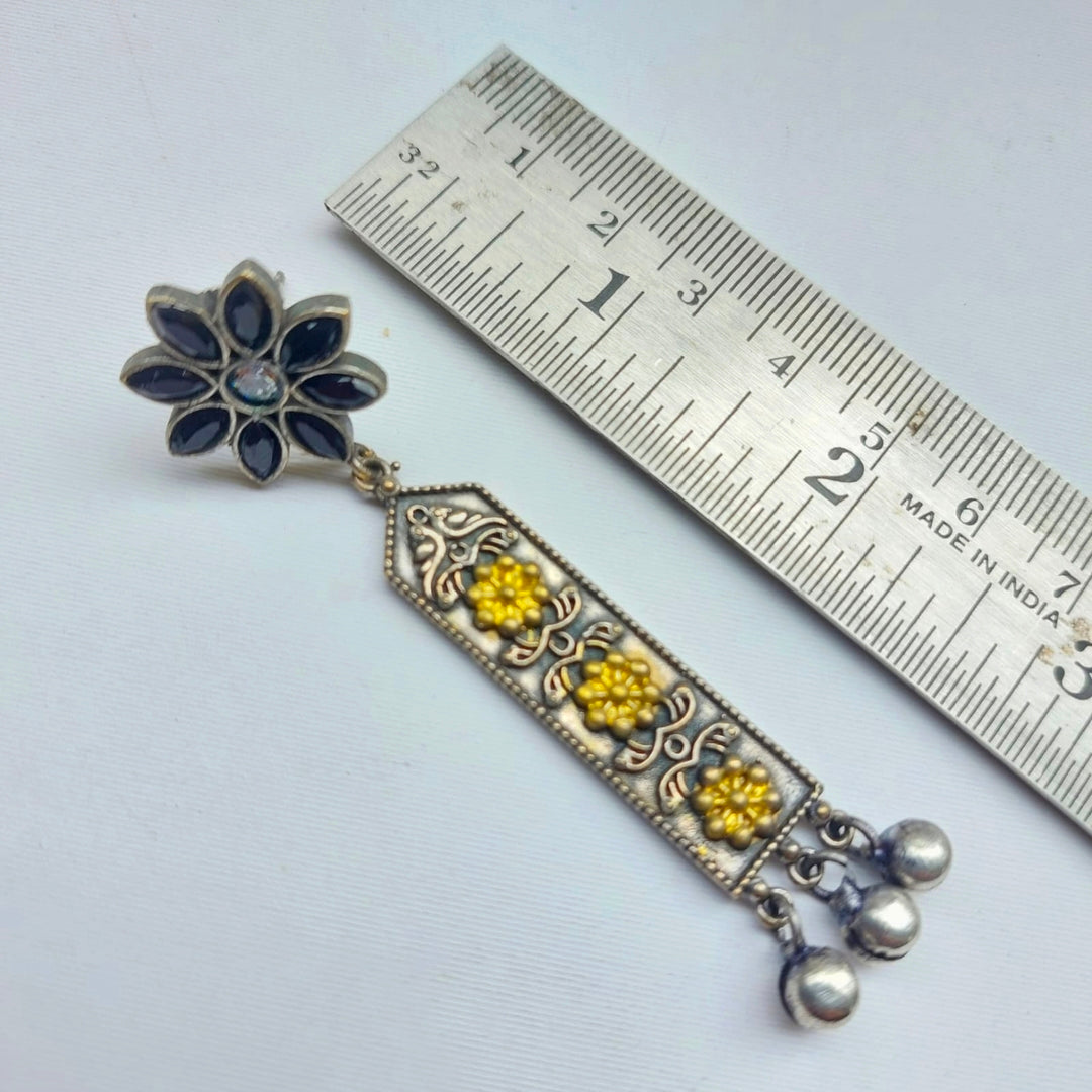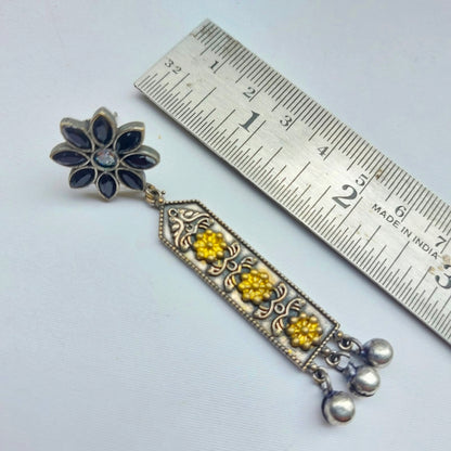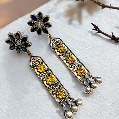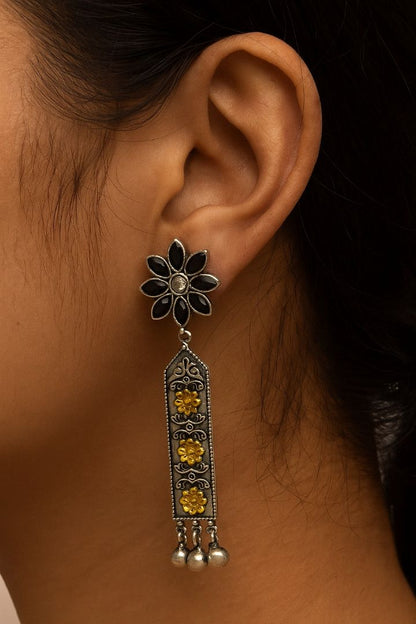 Floral Ethnica: Black Floral Silver Toned dangler Earrings