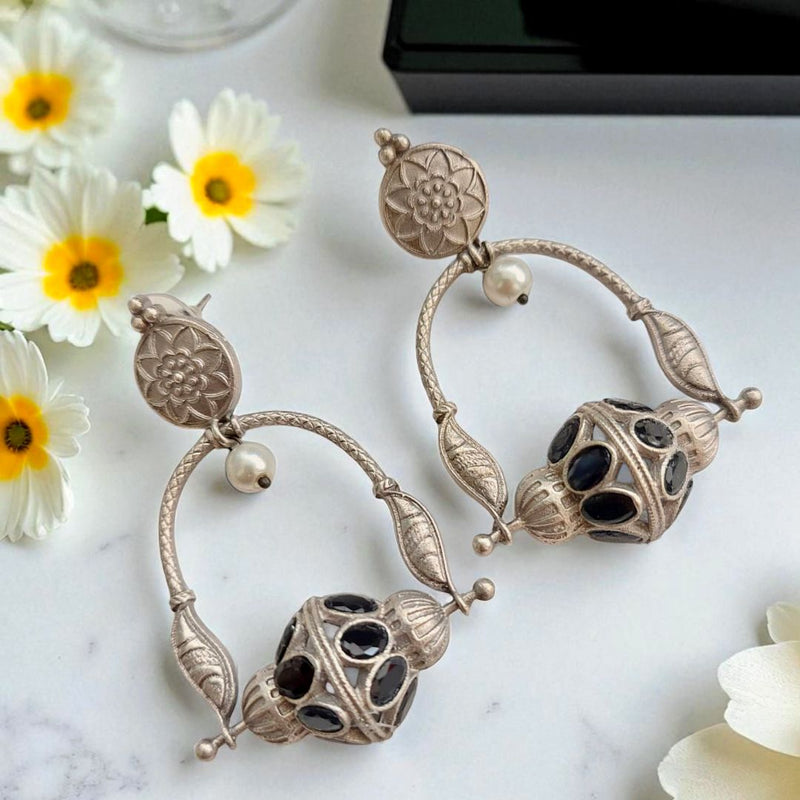 Stylish Dark Blue Carved Stone and Pearl Hoop earring