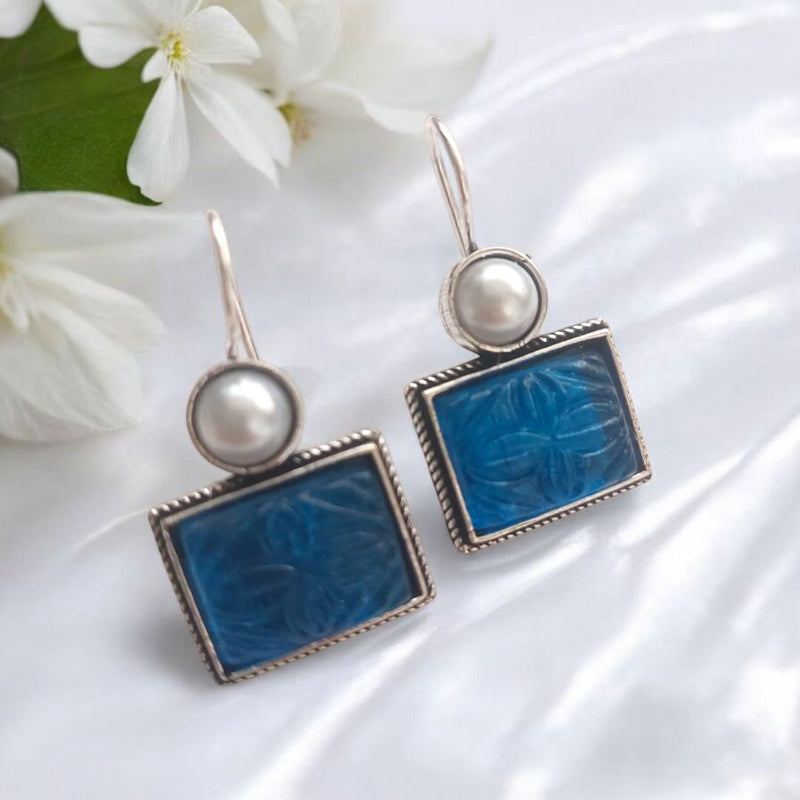 Add a touch of serene beauty with these captivating Dark Blue Carved Stone and Pearl Earrings. Each earring features a rectangular, deep navy blue stone showcasing intricate floral carvings, and a pearl set on top of it in a silver-toned frame.
