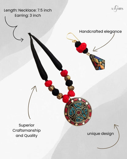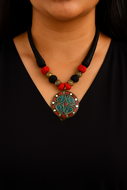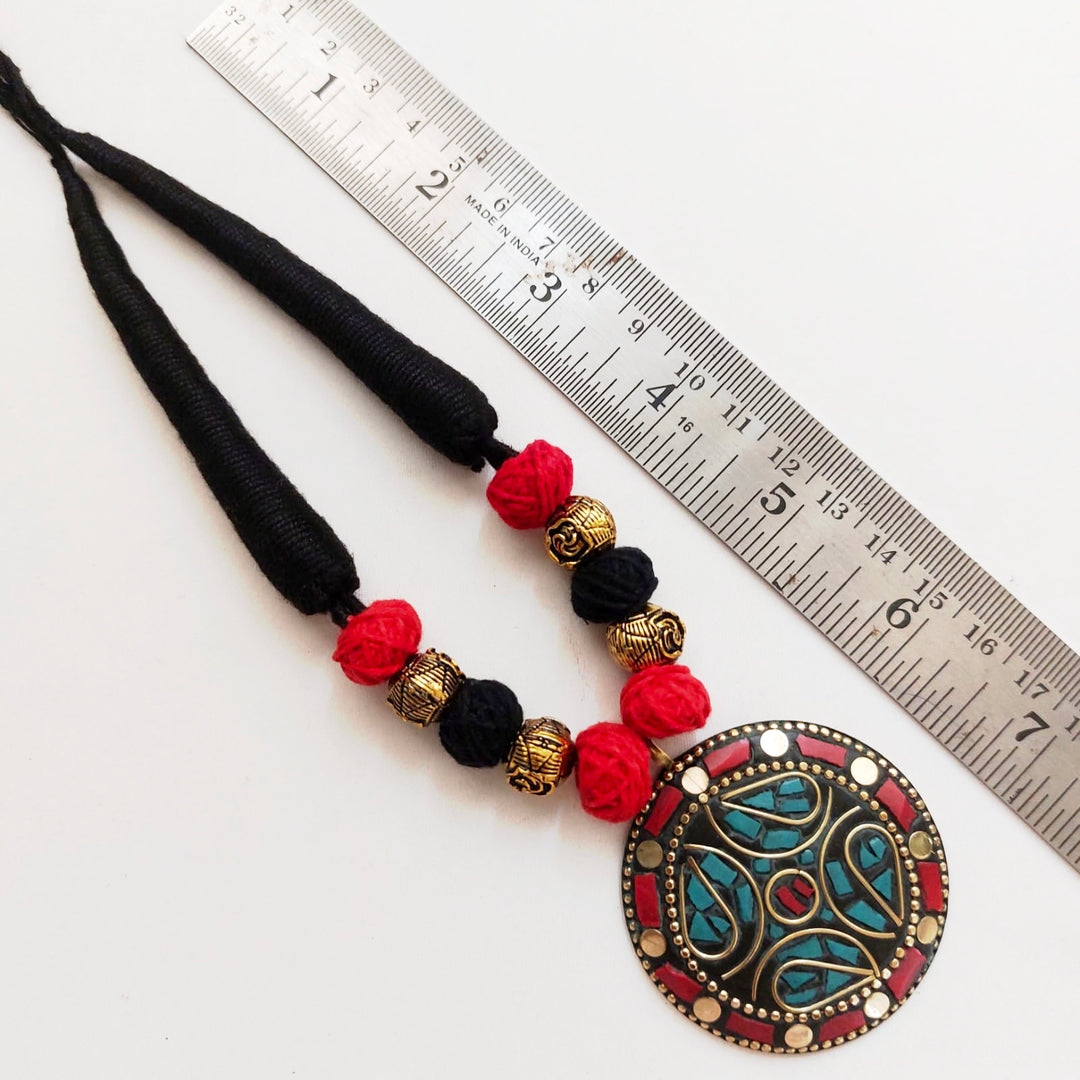 Add a touch of elegance to your look with this handcrafted necklace featuring a stunning circular pendant inlaid with vibrant red, turquoise, and gold mosaic. The pendant is handcrafted using authentic Tibetan lac, known for its rich texture and vibrant finish, making each piece truly one-of-a-kind.