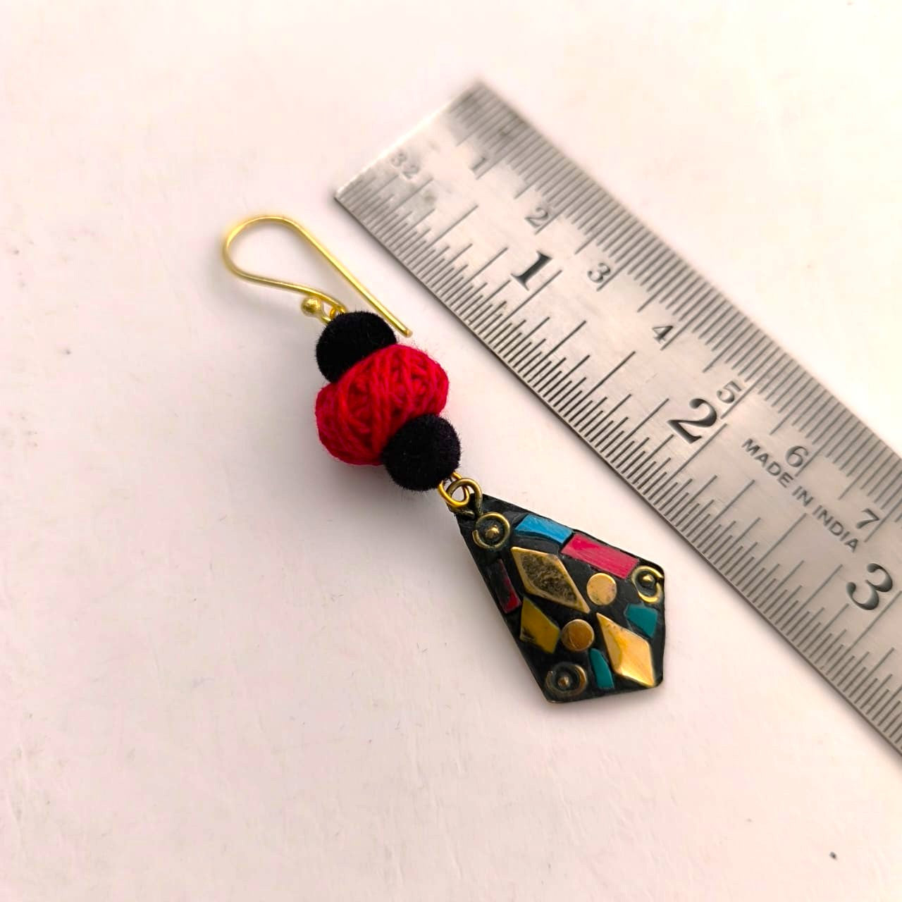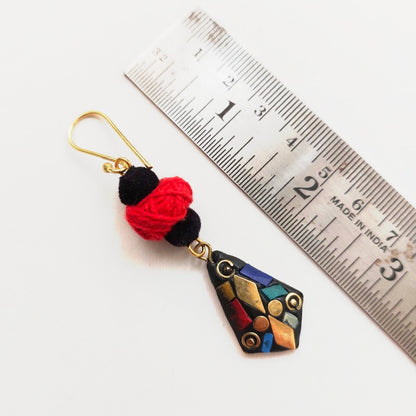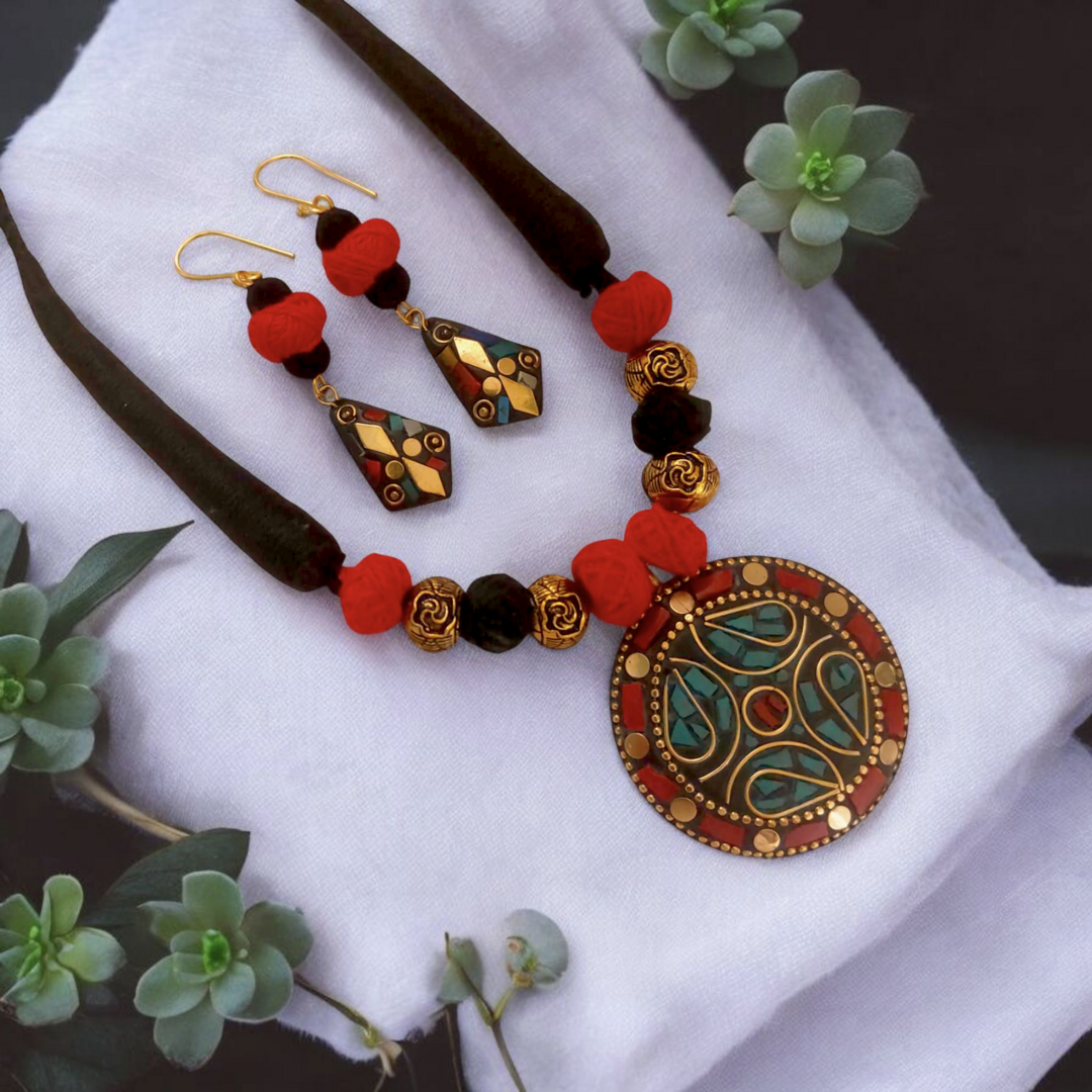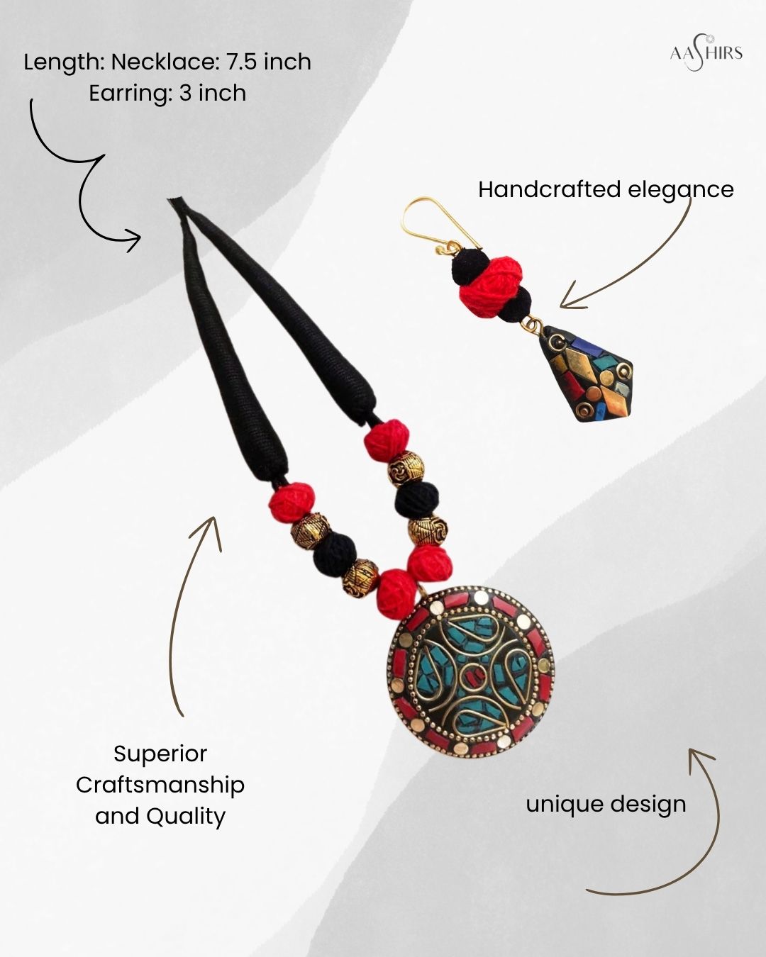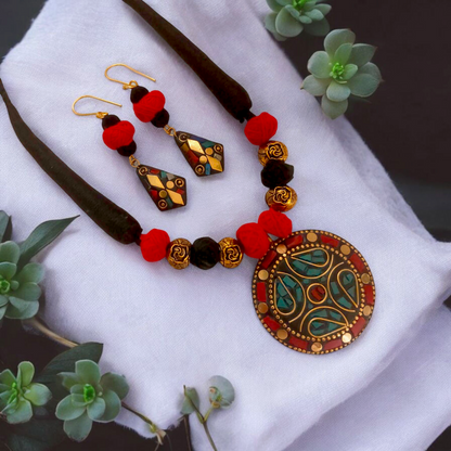 Decorated with intricately carved golden beads and soft red and black fabric thread beads, this necklace blends traditional artistry with bohemian charm. Paired with a beautiful pair of earrings in similar Tibetan lac finish this set is perfect for festivals, weddings, or statement styling.