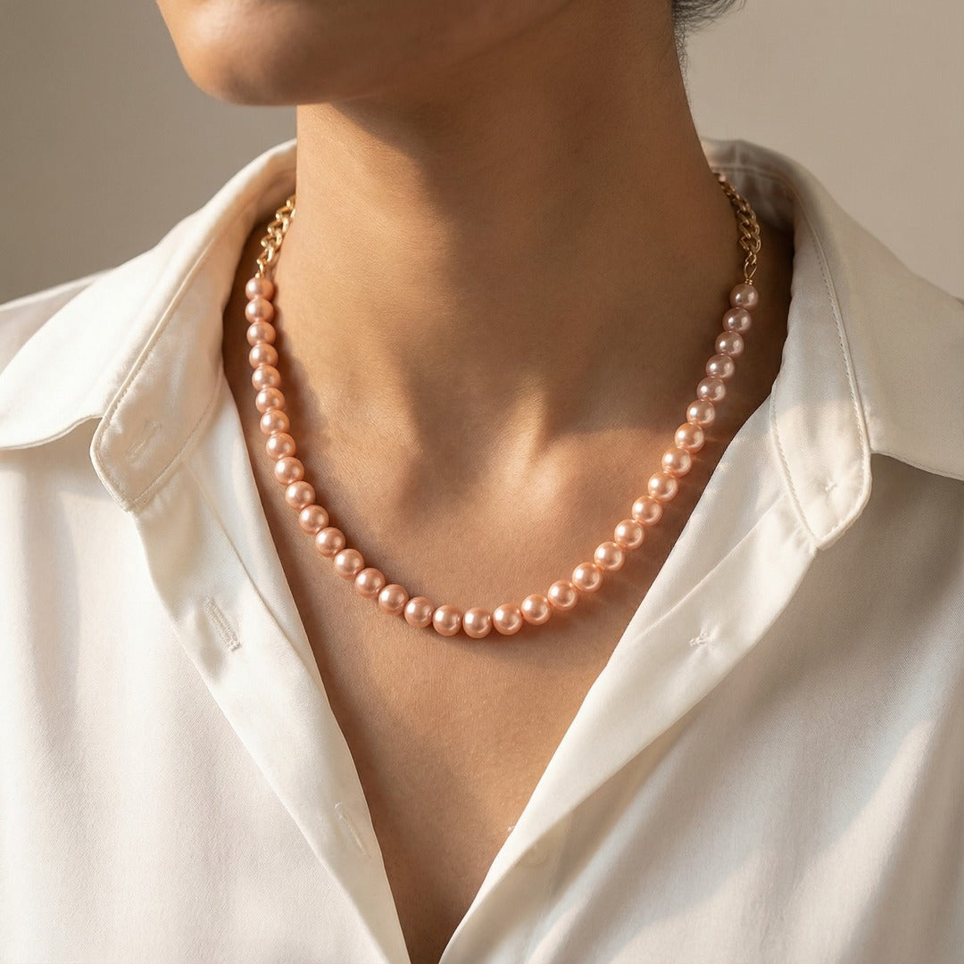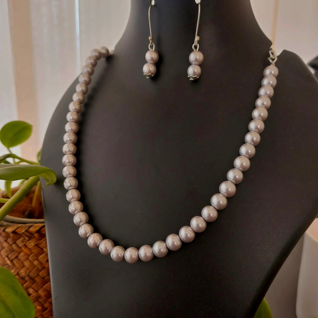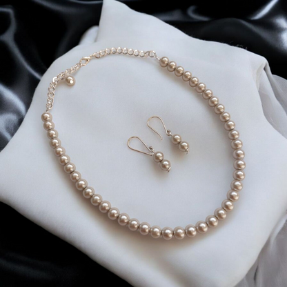 This elegant necklace and earring set features a delicate strand of lustrous, ivory-toned shell pearls, exuding a warm and subtle glow. The neutral hue offers exceptional versatility, making it the perfect complement to a wide range of outfits.