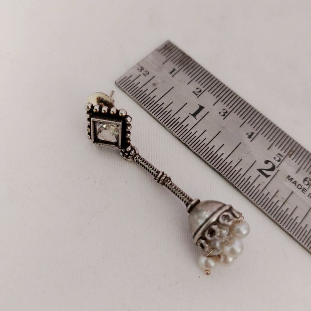 These earrings feature a radiant clear faceted stone set in a vintage-style square stud. A textured vertical connector leads to a dome-shaped jhumka, finished with delicate pearl-like beads—elegant, intricate, and endlessly versatile. -