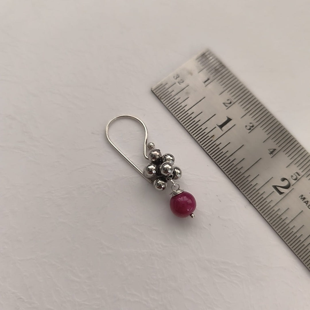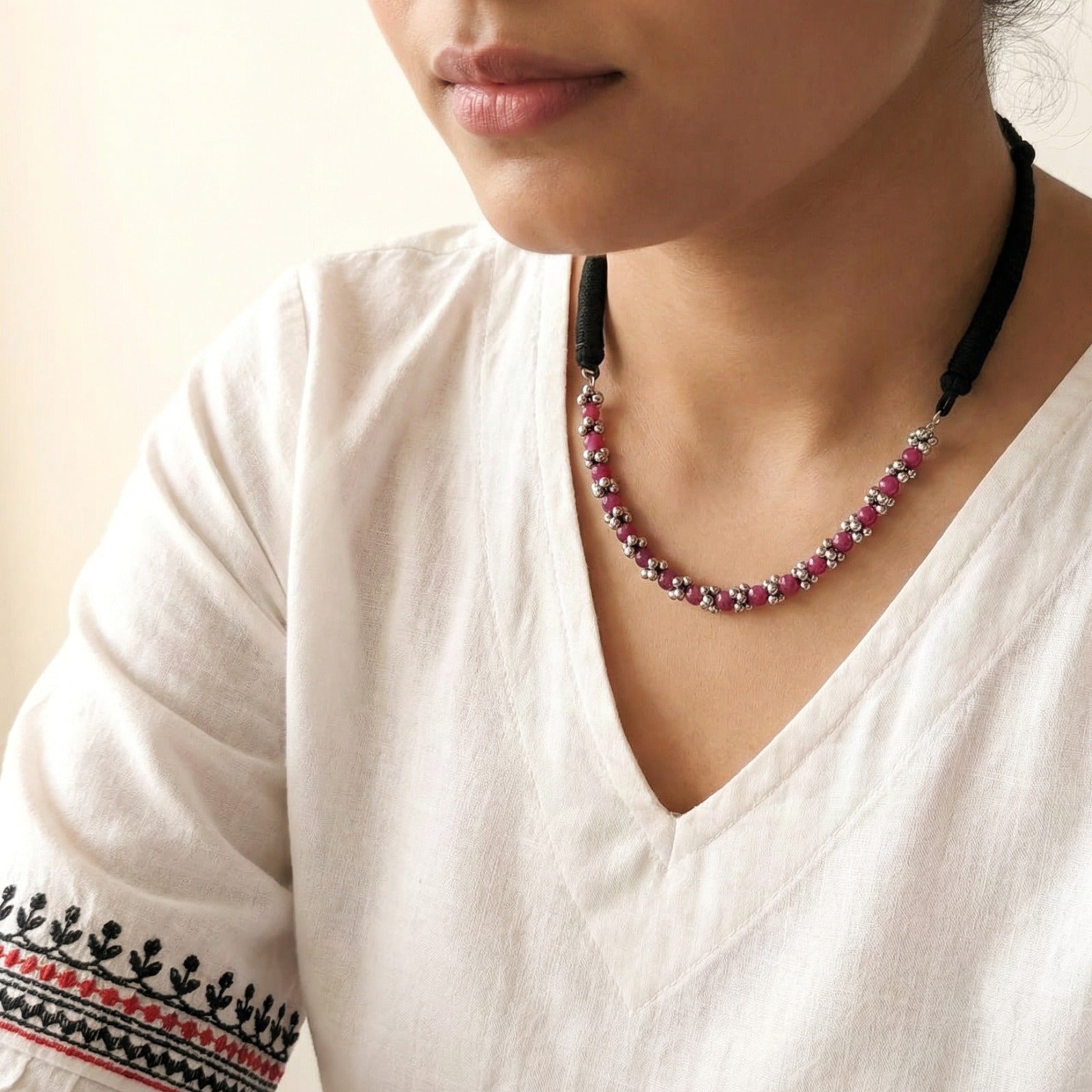 Sometimes all you need is a splash of tradition to brighten your day, and this Kolhapuri set does exactly that. The necklace features rich ruby-toned beads paired with traditional silver-toned Kolhapuri ghungroo-style elements, creating a classic yet contemporary ethnic look. Finished with a soft, adjustable thread dori, it sits comfortably on the neckline for both casual and festive styling. The matching earrings, designed with delicate silver clusters and a single ruby bead drop, complete the set with effortless elegance.