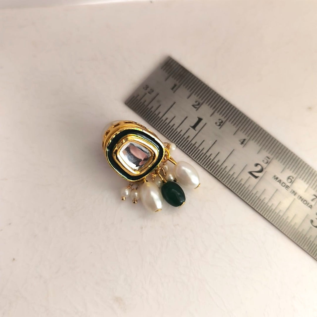 A vision of timeless grace, this statement set blends delicate craftsmanship with regal charm. Featuring luminous strands of fine pearls anchored by a sculpted, kundan finish centerpiece, the design is elevated with rich green accents that lend depth and quiet opulence.