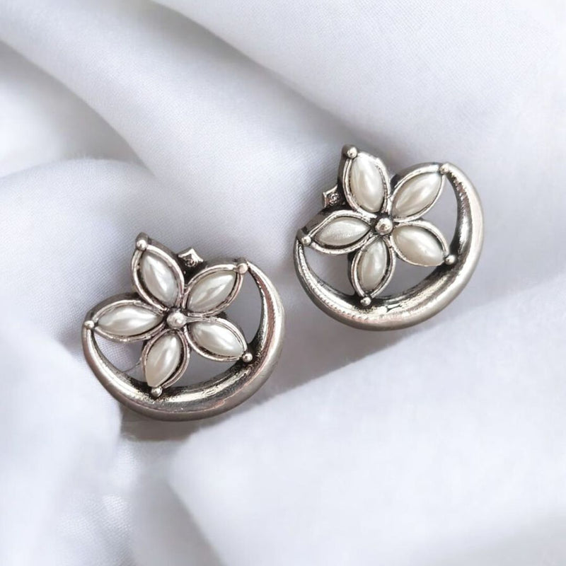 Evoke timeless elegance with our Silver toned Pearl Studs. These silver-toned earrings feature a crescent moon base encircling a delicate floral motif, crafted from luminous, pearls.
