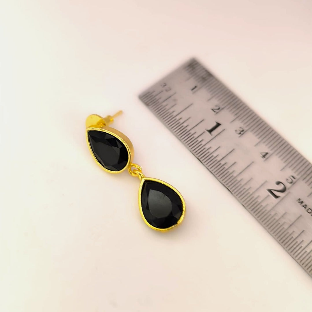 - Design: Classic teardrop design with a symmetrical arrangement of black stones in a sleek gold setting.