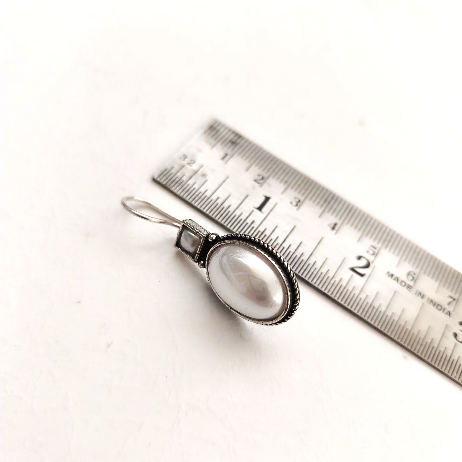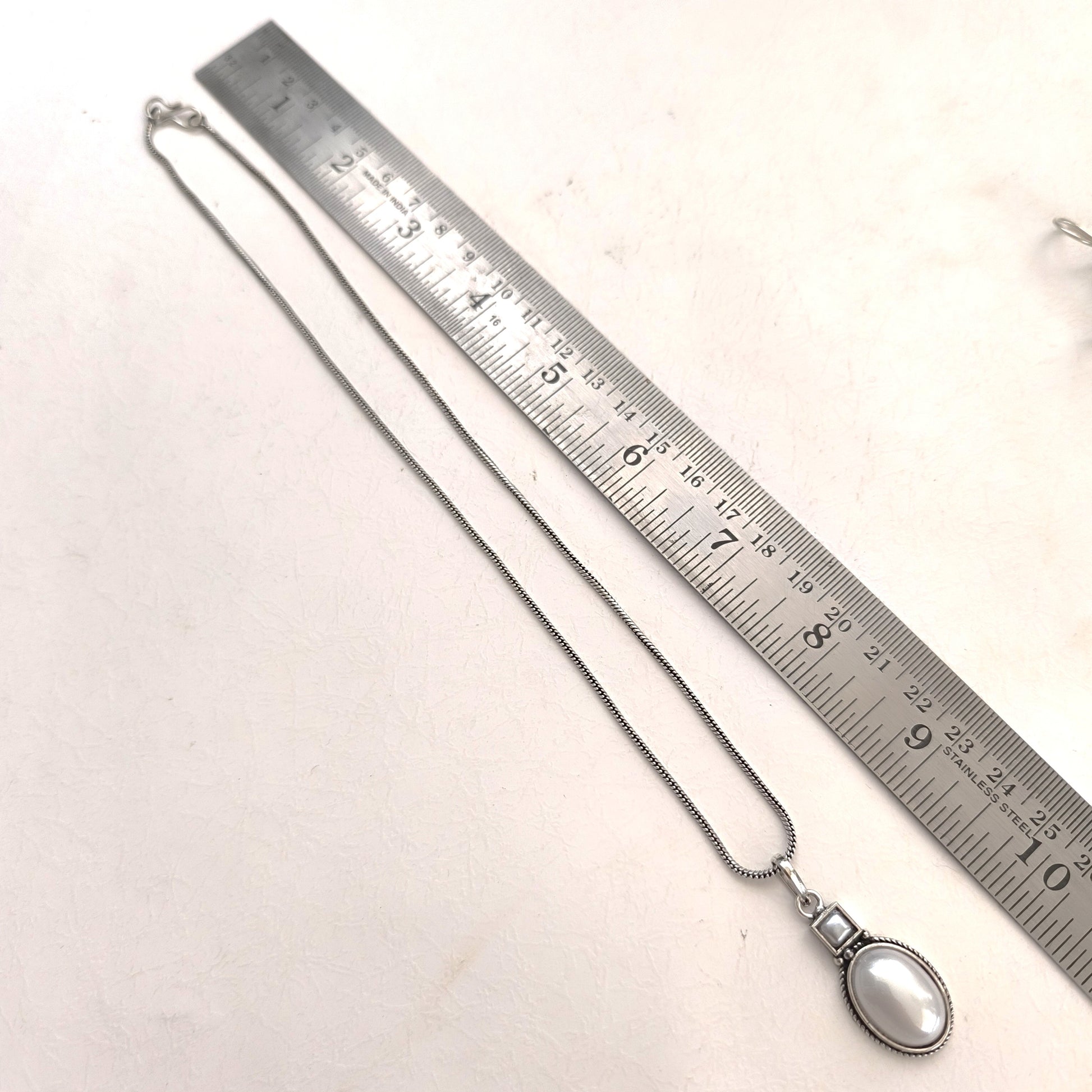 Featuring a graceful oval stone with a natural pearly glow, this handcrafted silver pendant and earring set captures light beautifully, creating a serene, moonlit shimmer with every movement. The delicately textured silver bezel frames the stone with vintage charm, while the clean drop silhouette adds a modern, wearable elegance.