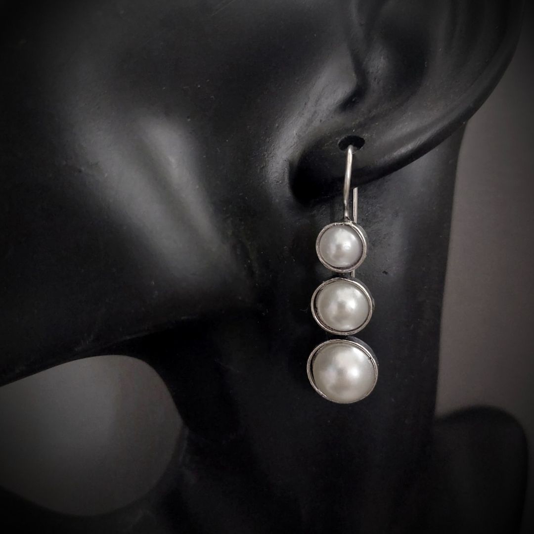 These elegant drop earrings feature a graceful cascade of three lustrous pearls, suspended from delicate silver-toned hooks. The varying sizes of the pearls create a captivating visual rhythm, while the classic design ensures timeless appeal.