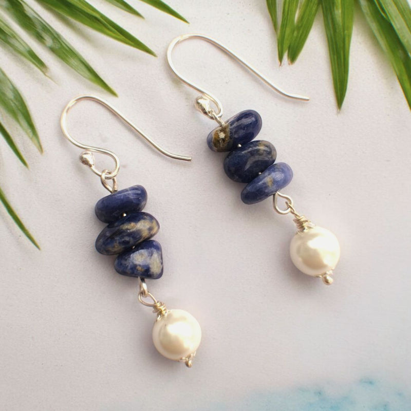 The twilight Earrings are perfect for both casual and formal outfits. Their blend of deep blue-grey semi precious beadss and a lustrous pearl drop adds a subtle yet elegant touch, making them versatile for day or evening wear.