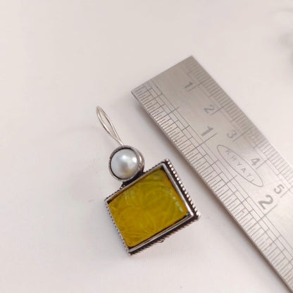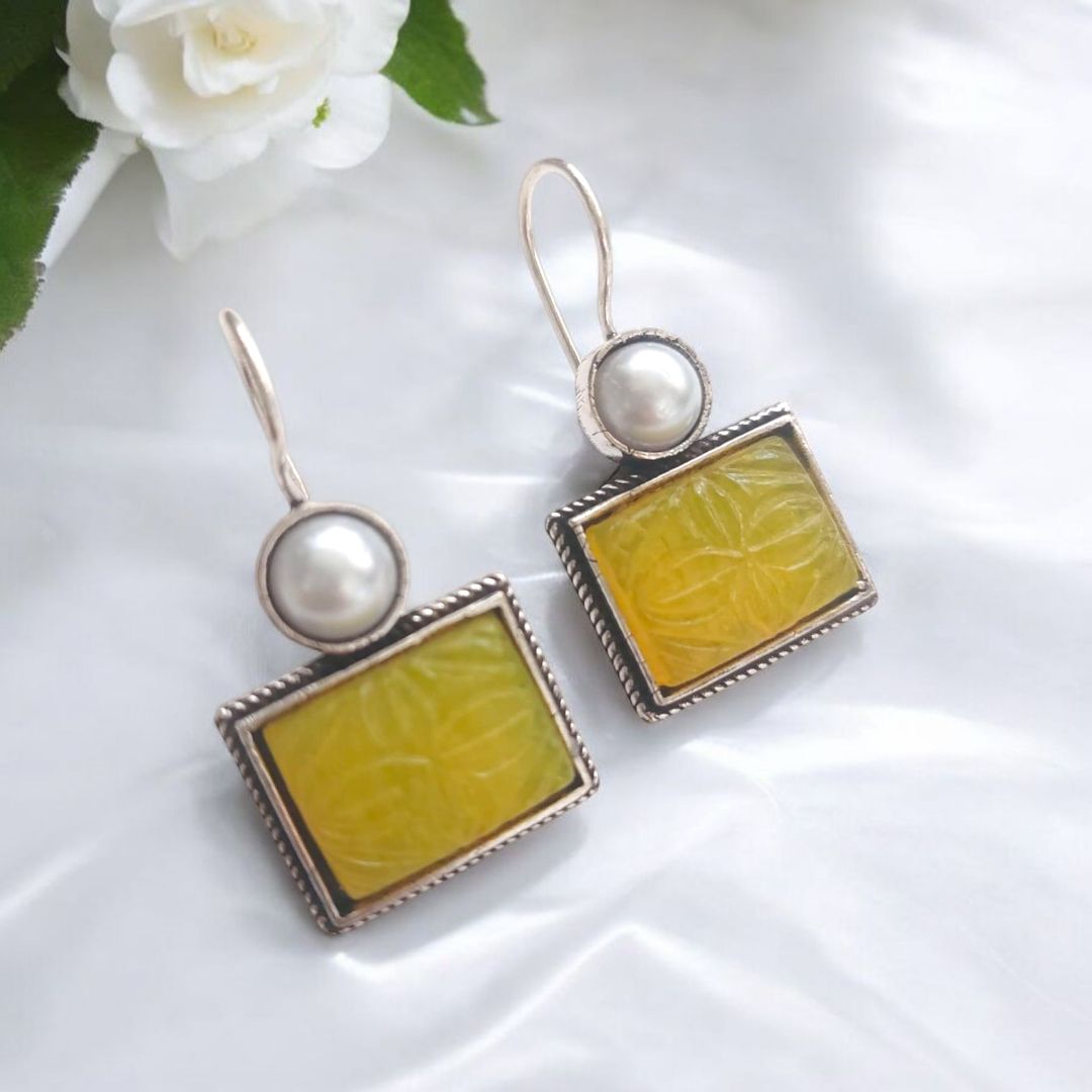 Shine bright with these yellow carved stone earrings, beautifully finished with a luminous pearl. Set in a silver frame, the rectangular stone features intricate floral carving that adds a handcrafted, artisanal charm.