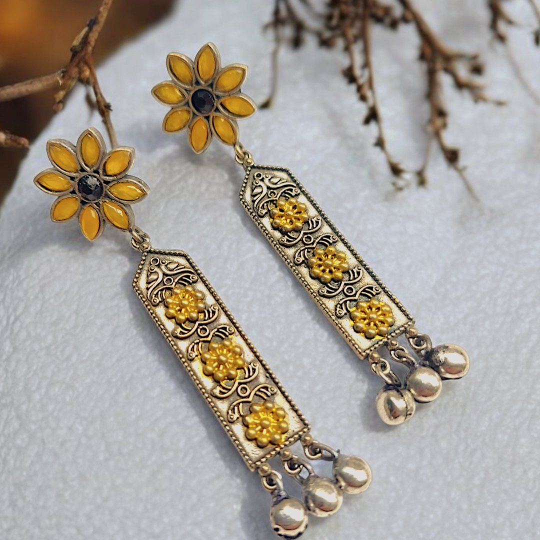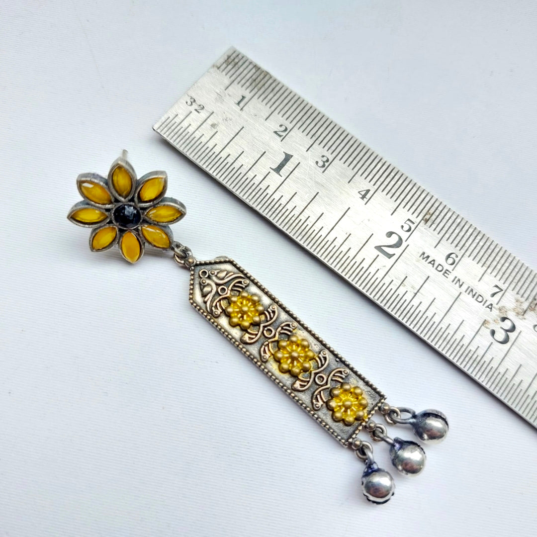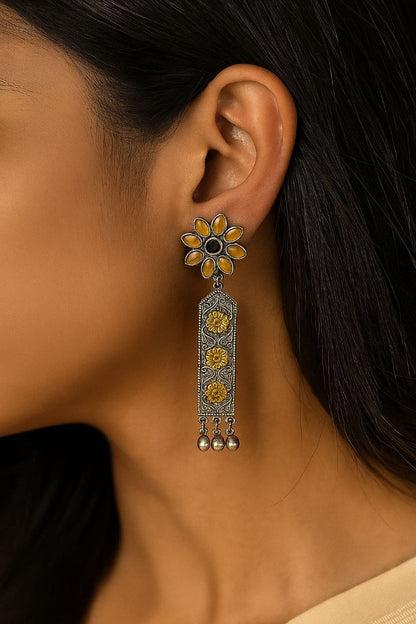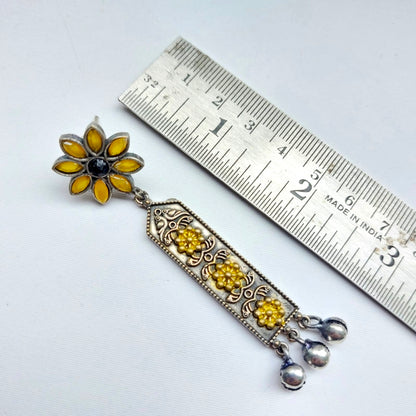 Floral Ethnica: Mustard Floral Silver Toned Dangler Earrings