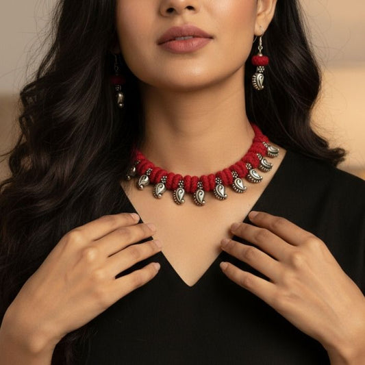 Rs. 1,199Sale price Rs. 850Desi Threads: Red Thread Bead and Silver Mango Motif Necklace and Earring