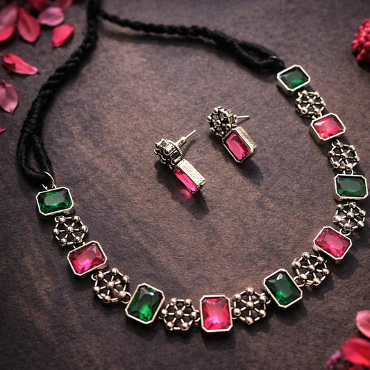 Rs. 1,320Sale price Rs. 930Pacchi Work Dual Tone German Silver Necklace with Green & Pink Stones